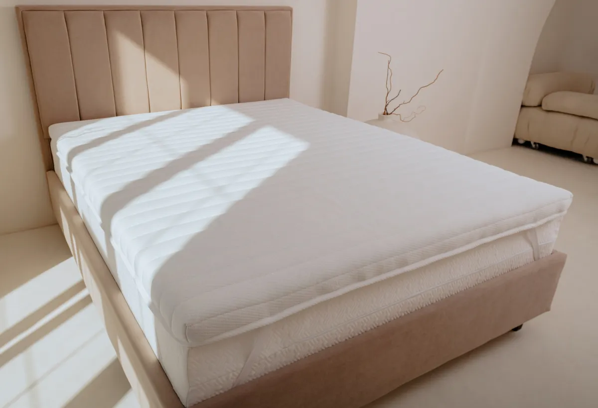 Топпер «Мята»: мягкость и расслаблениеЭто самый мягкий топпер в серии. Он создан не для поддержки спины, а для комфорта и ощущения уюта. Внутри два слоя. Основа — 6 см упругой ортопедической пены. Она держит форму и сглаживает все бугры вашего старого матраса. А сверху — 3 см мягкой пены Soft. Именно она и даёт тот самый эффект нежного «утонуть», когда вы ложитесь. Чехол из стёганого трикотажа добавляет приятных ощущений. Вместе они создают мягкую, но не проваливающуюся поверхность.